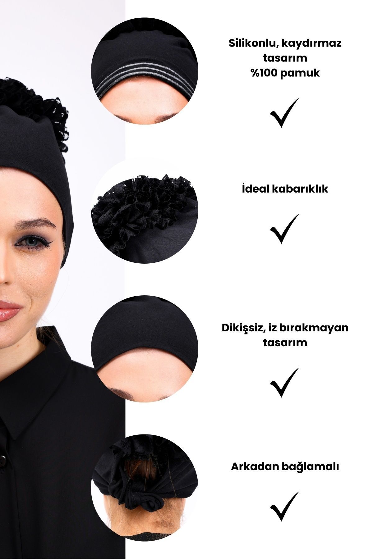 Ürün Boyutu: Standart Paket İçeriği: 1'er adet fırfırlı ve düz silikonlu kaymaz bone siyah renk