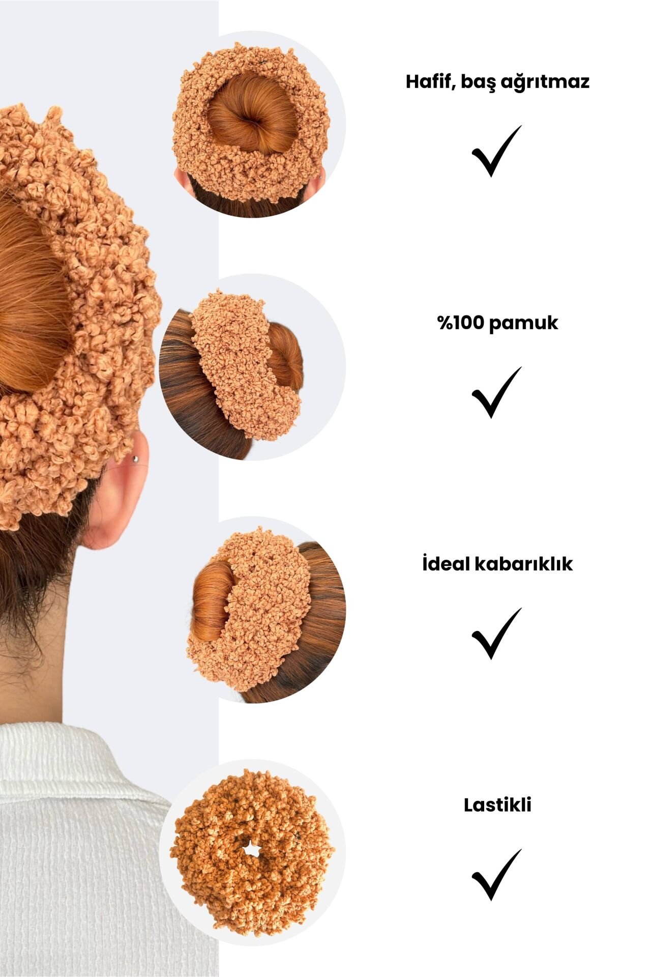 Lastikli yapısı sayesinde topuza uyum sağlar. Saçınızı kolayca şekillendirir.