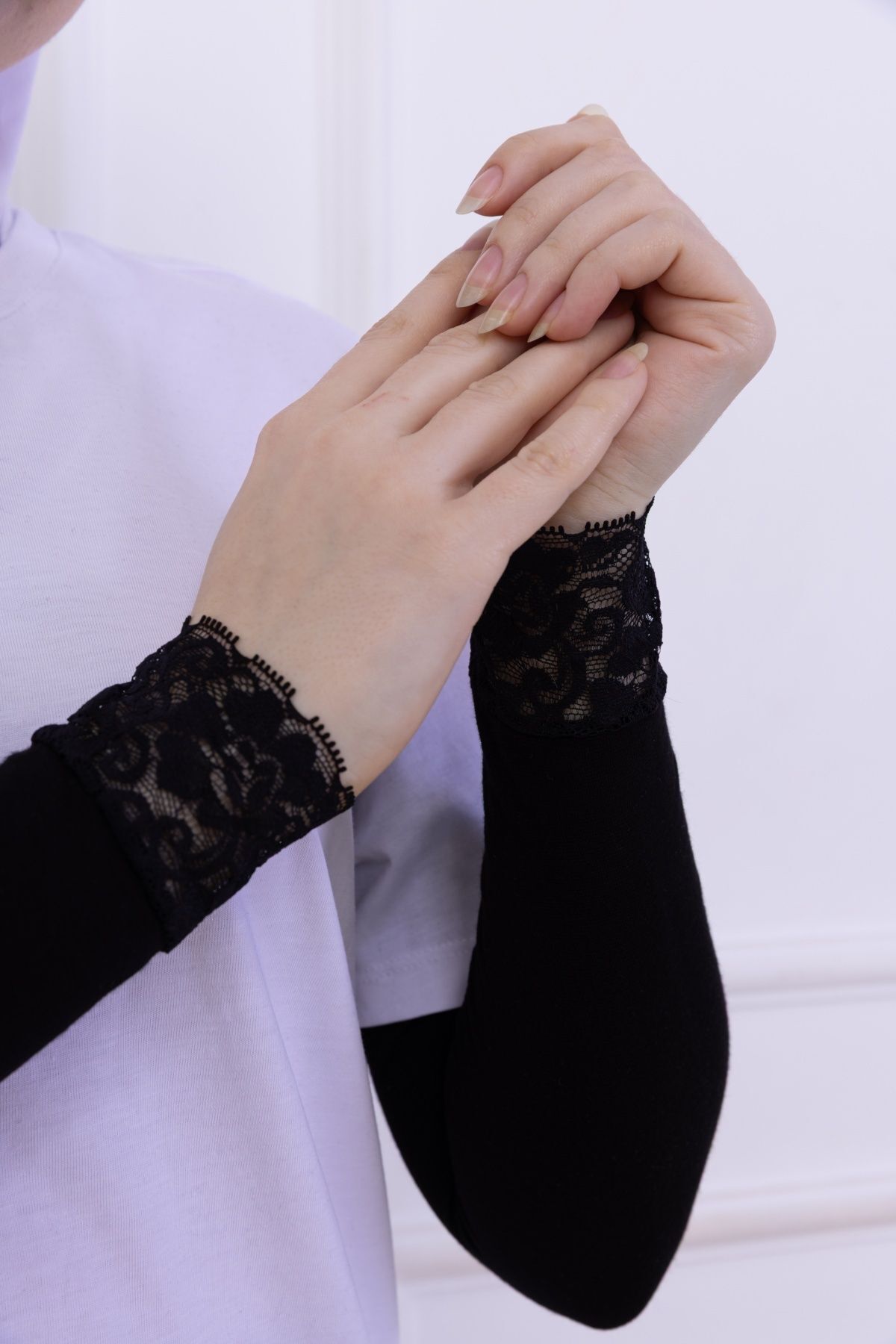 Dantel Detaylı Likralı Kolluk - Kadın Tesettür Düz Namaz Kolluğu 1 Çift 40cm Viskon Hijab Siyah