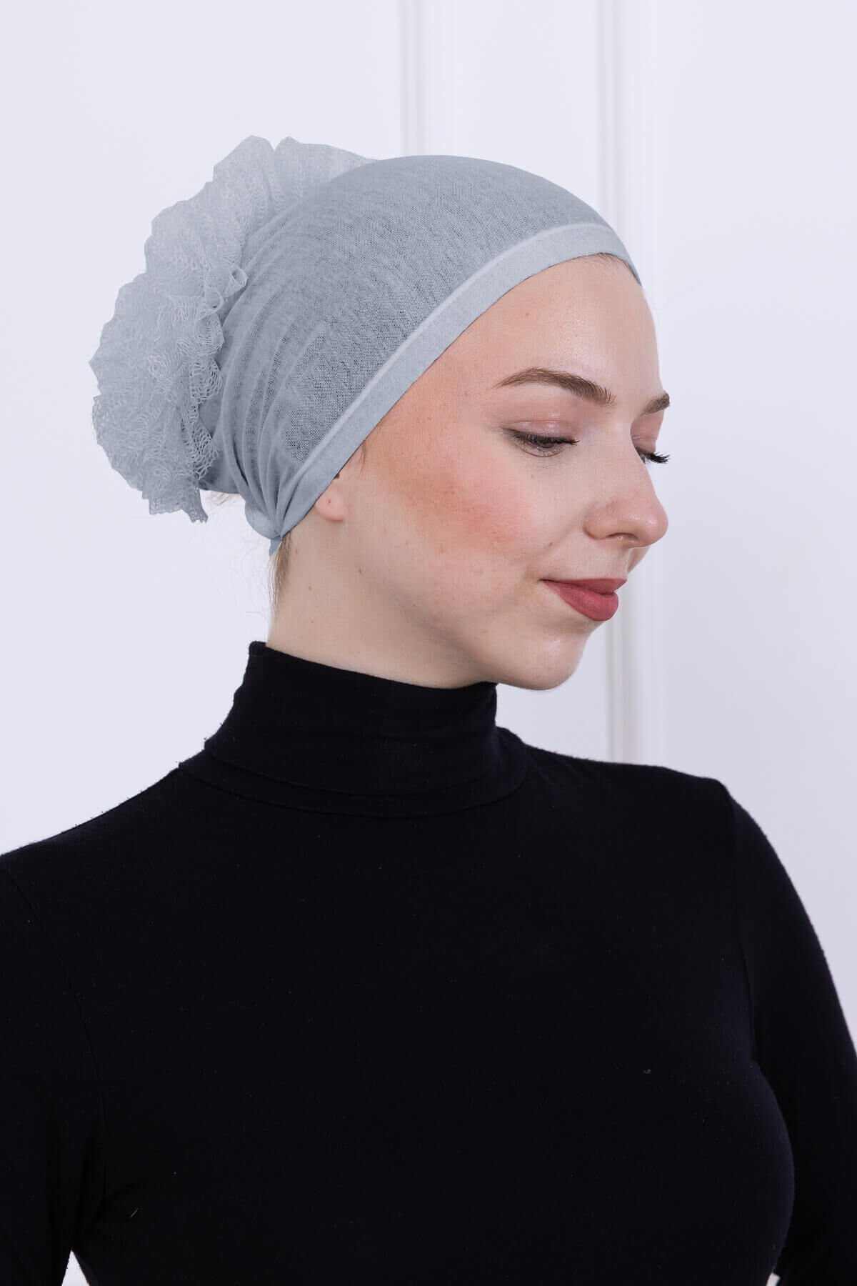 Fırfırlı Önden Dikişli Penye Bone - Kadın Tesettür Bağlamalı Topuz İç Bone Açık Gri