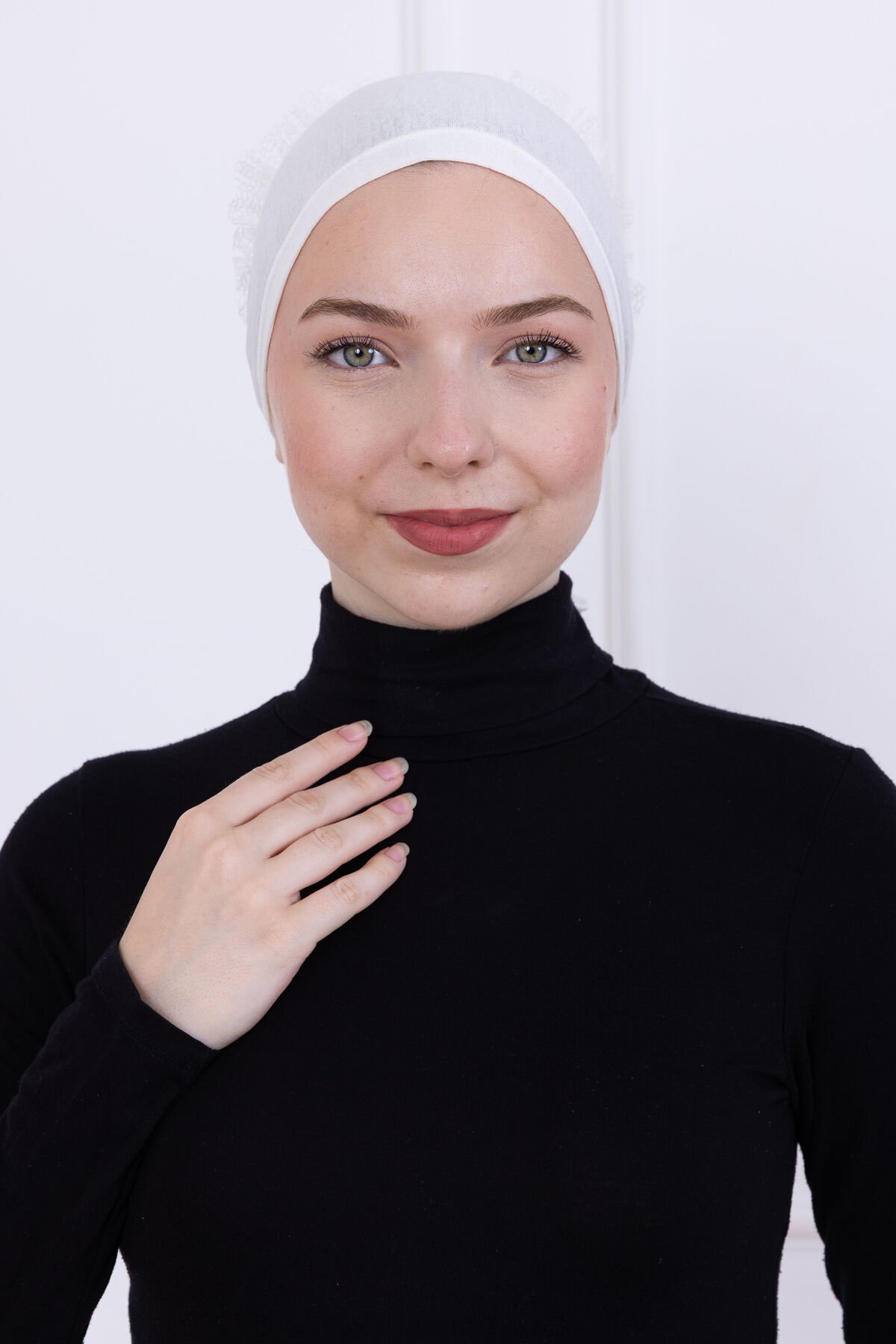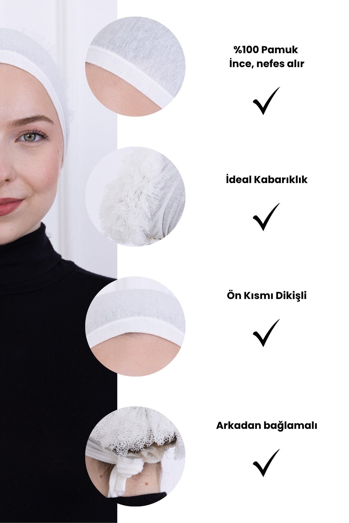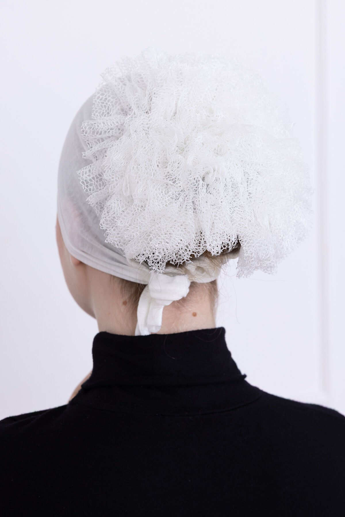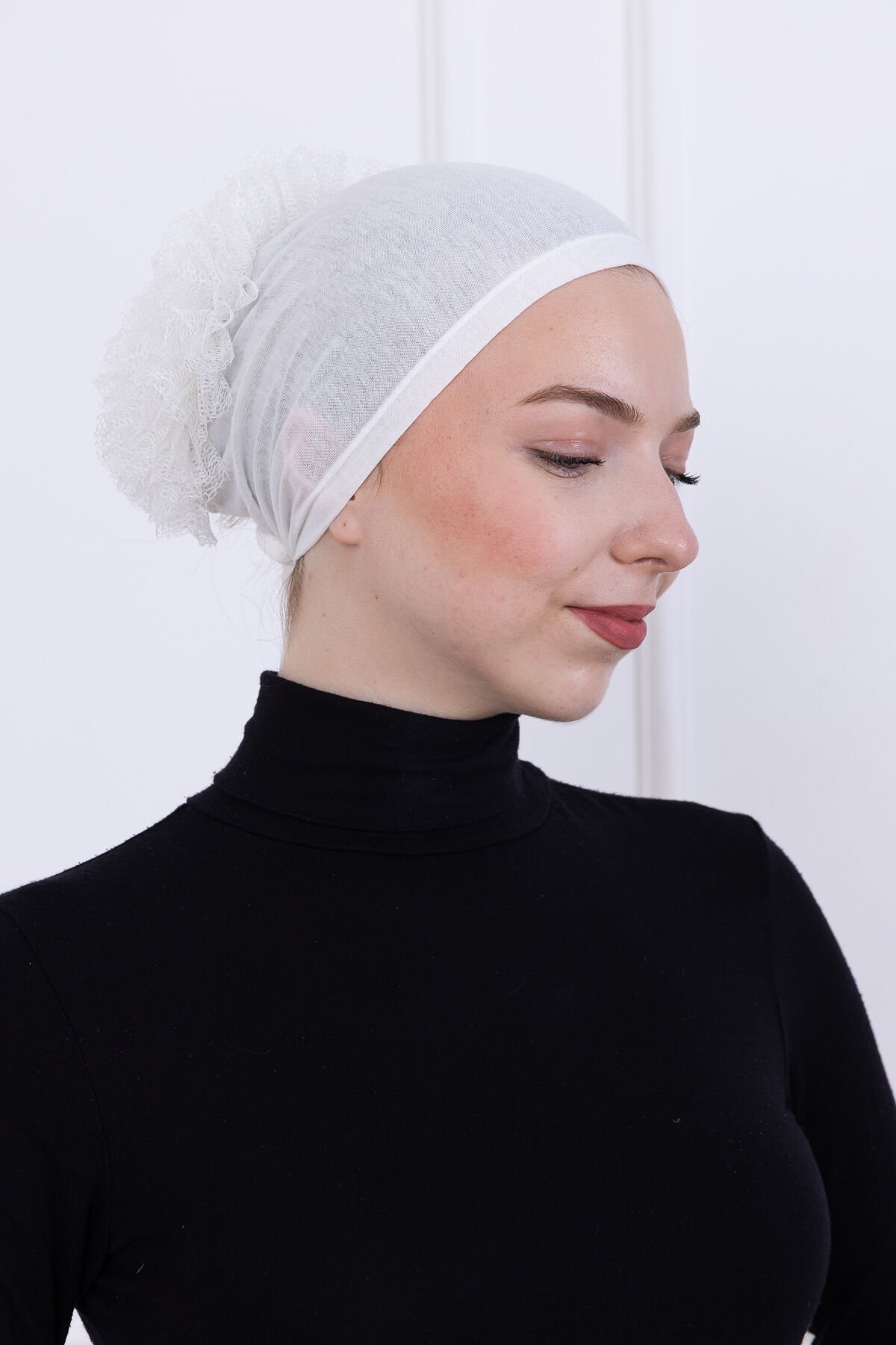 Fırfırlı Önden Dikişli Penye Bone - Kadın Tesettür Bağlamalı Topuz İç Bone Beyaz