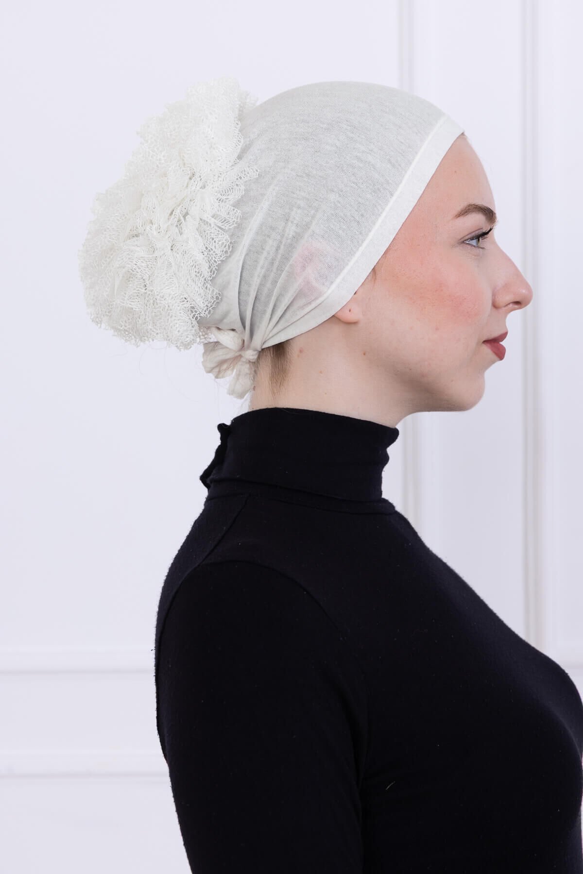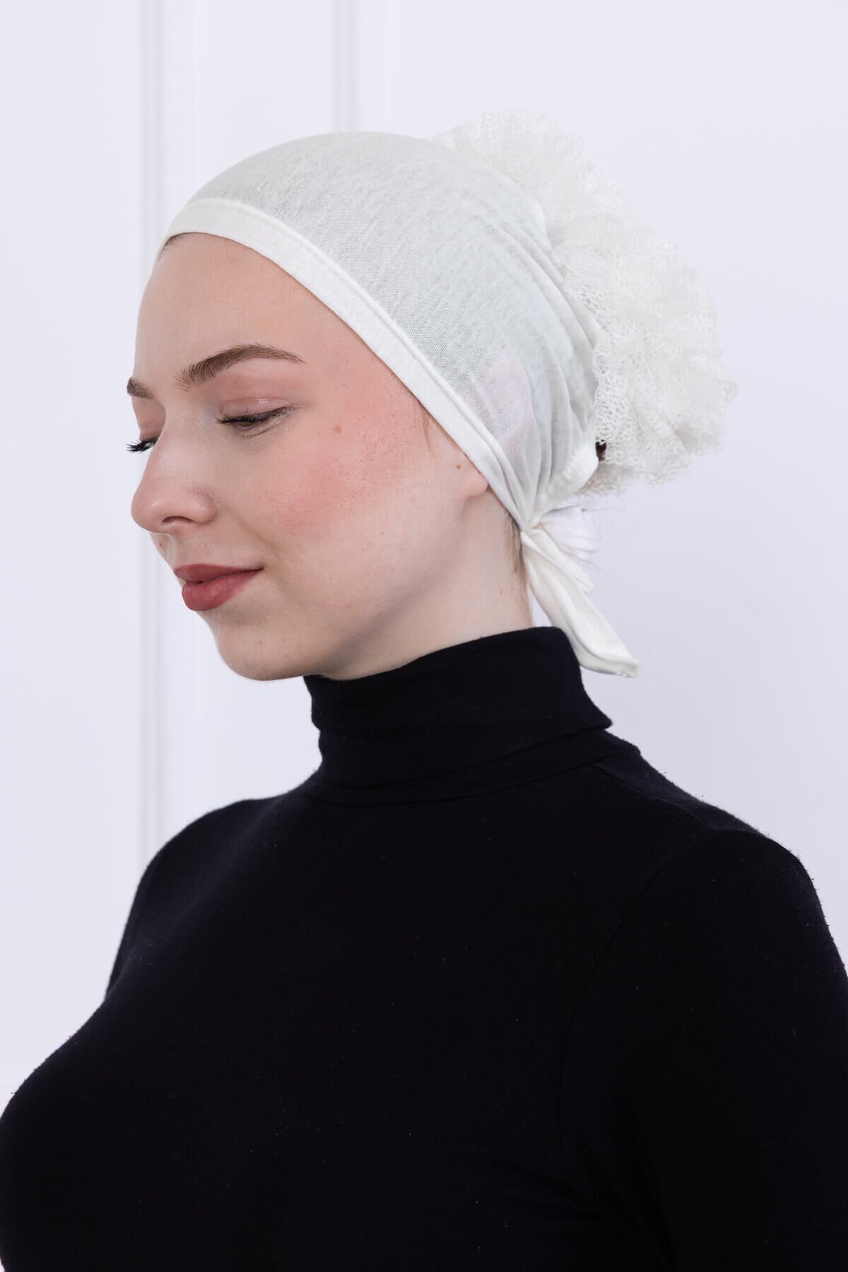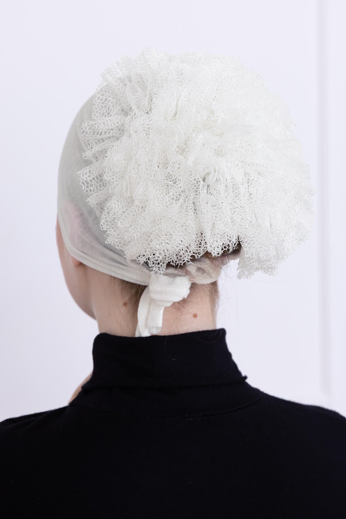 Fırfırlı Önden Dikişli Penye Bone - Kadın Tesettür Bağlamalı Topuz İç Bone Ekru - Kırık Beyaz