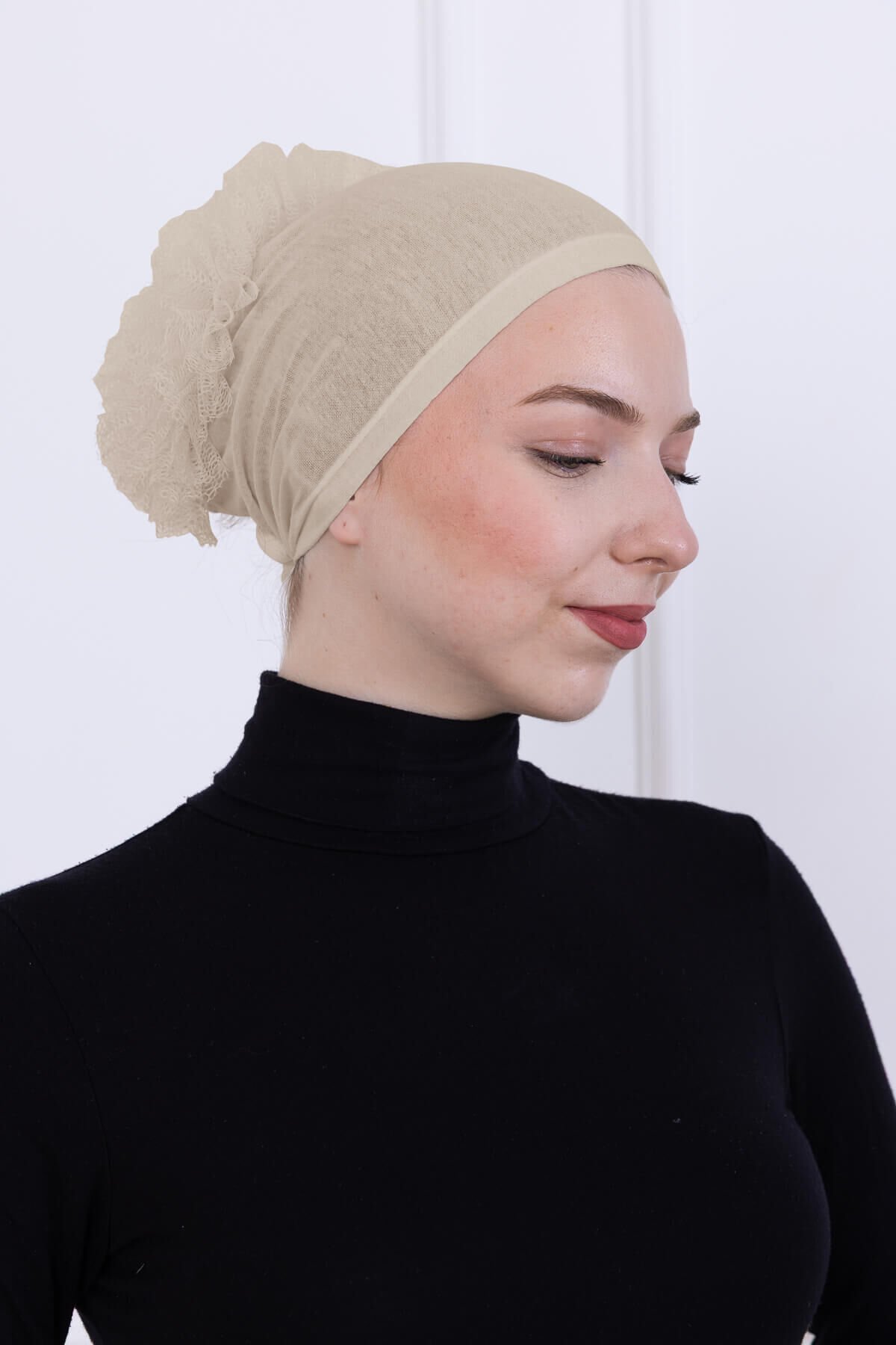 Fırfırlı Önden Dikişli Penye Bone - Kadın Tesettür Bağlamalı Topuz İç Bone Krem
