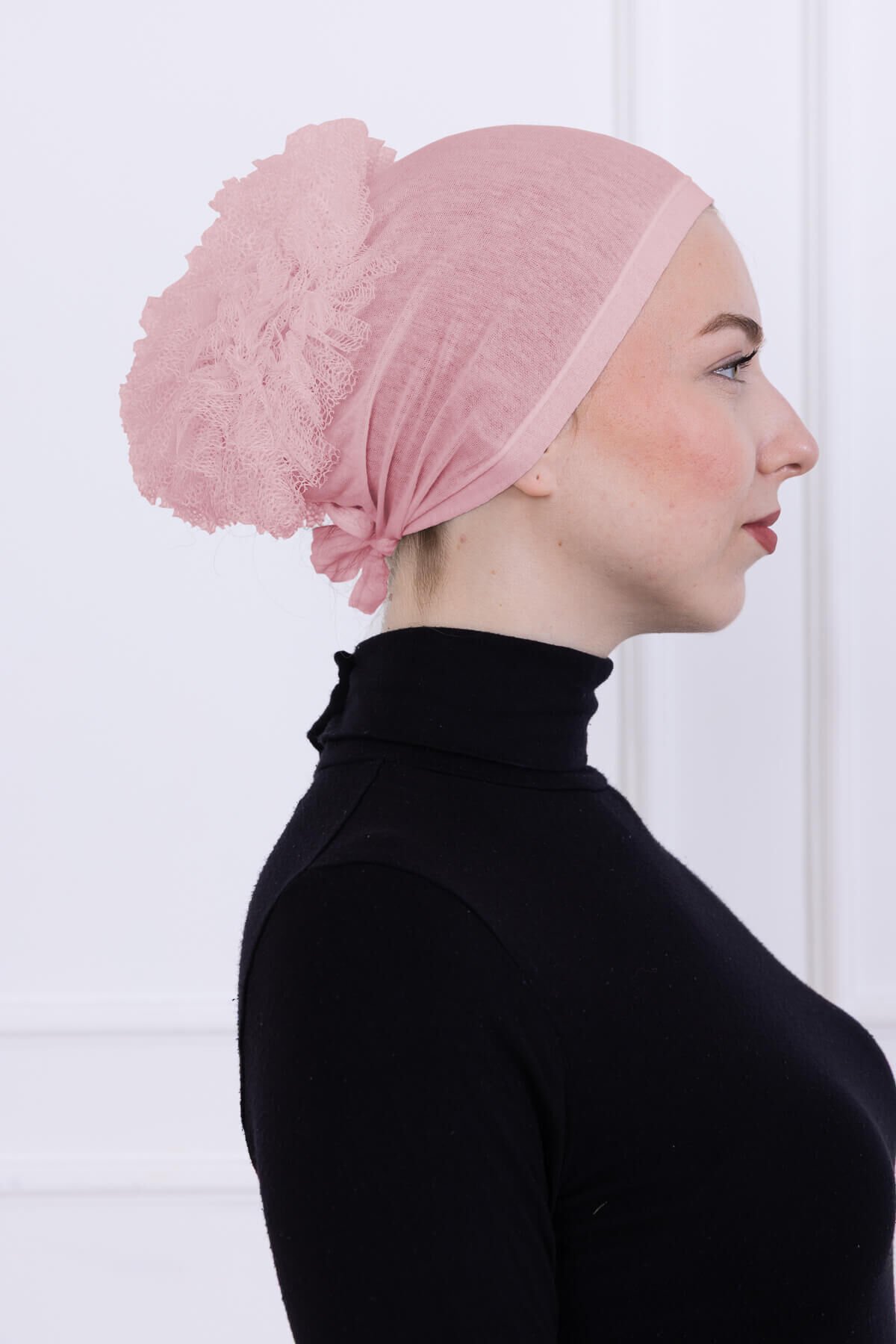 Fırfırlı Önden Dikişli Penye Bone - Kadın Tesettür Bağlamalı Topuz İç Bone Pembe
