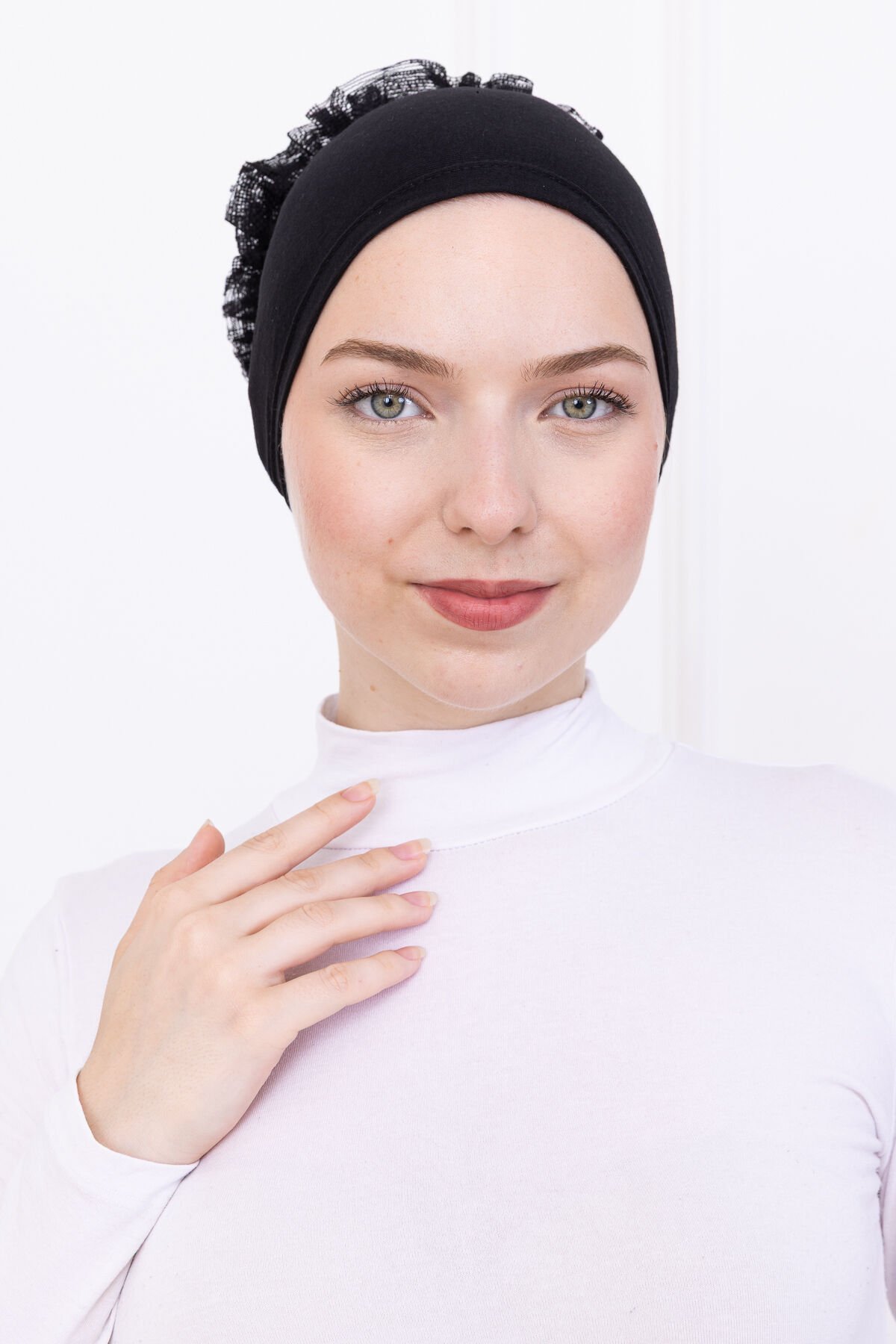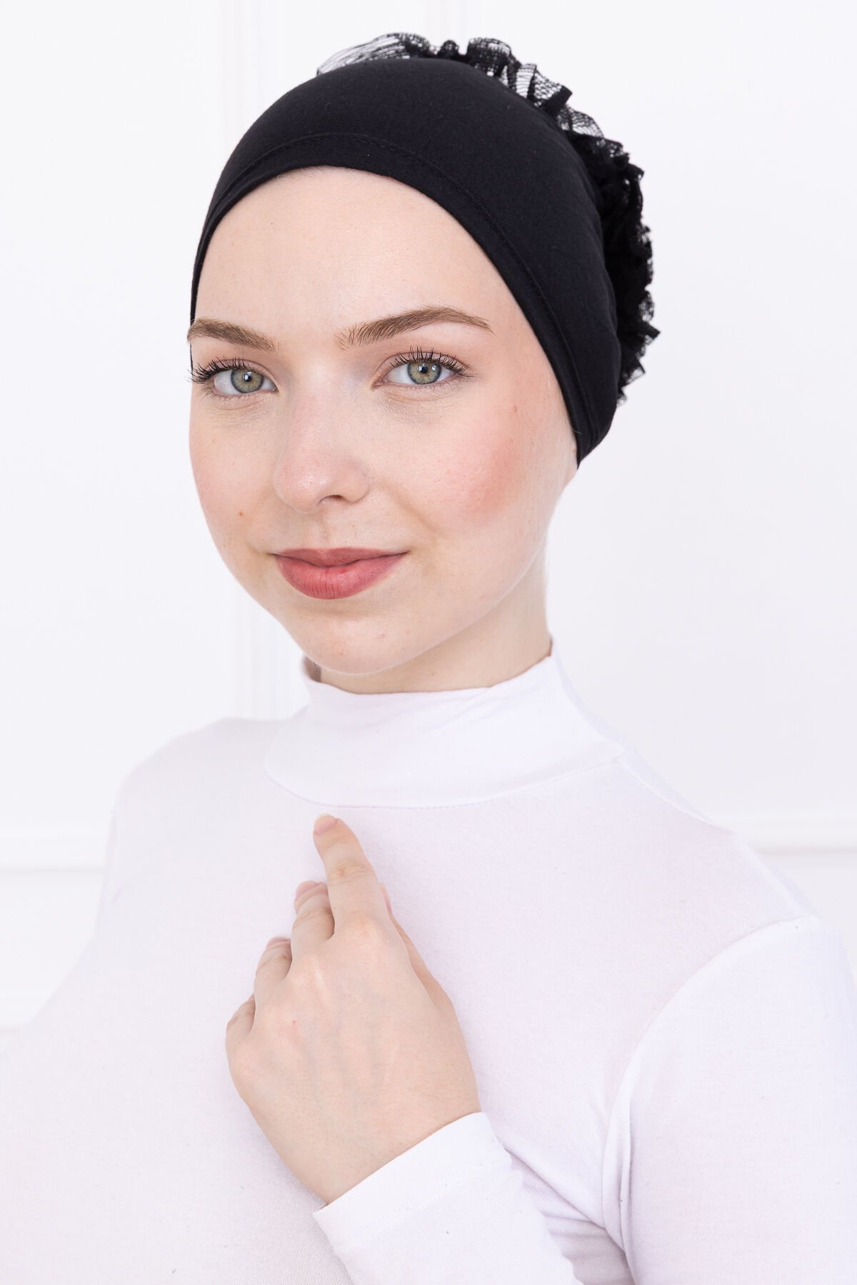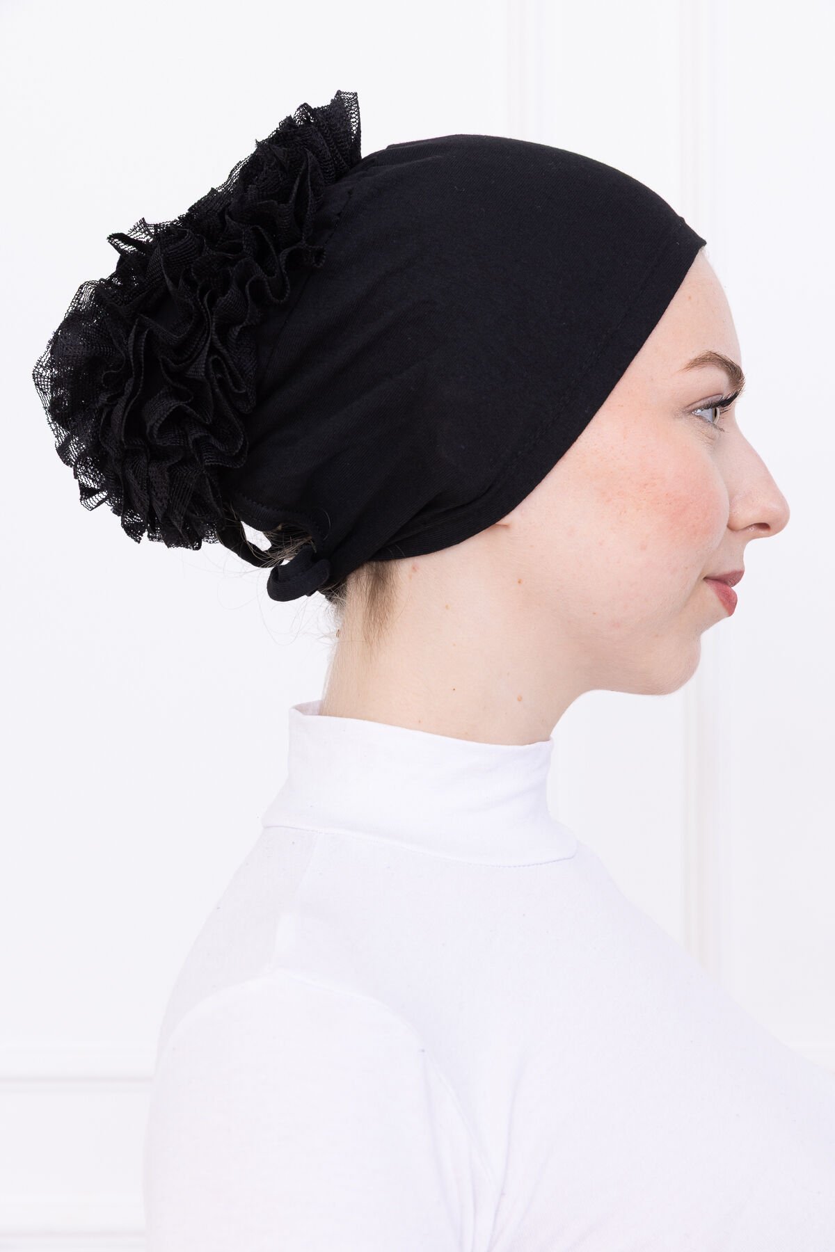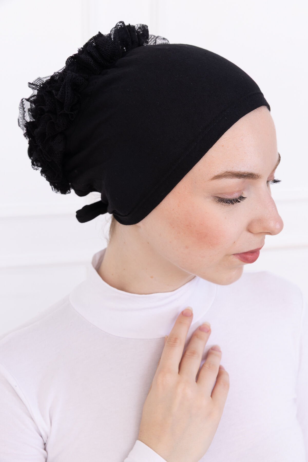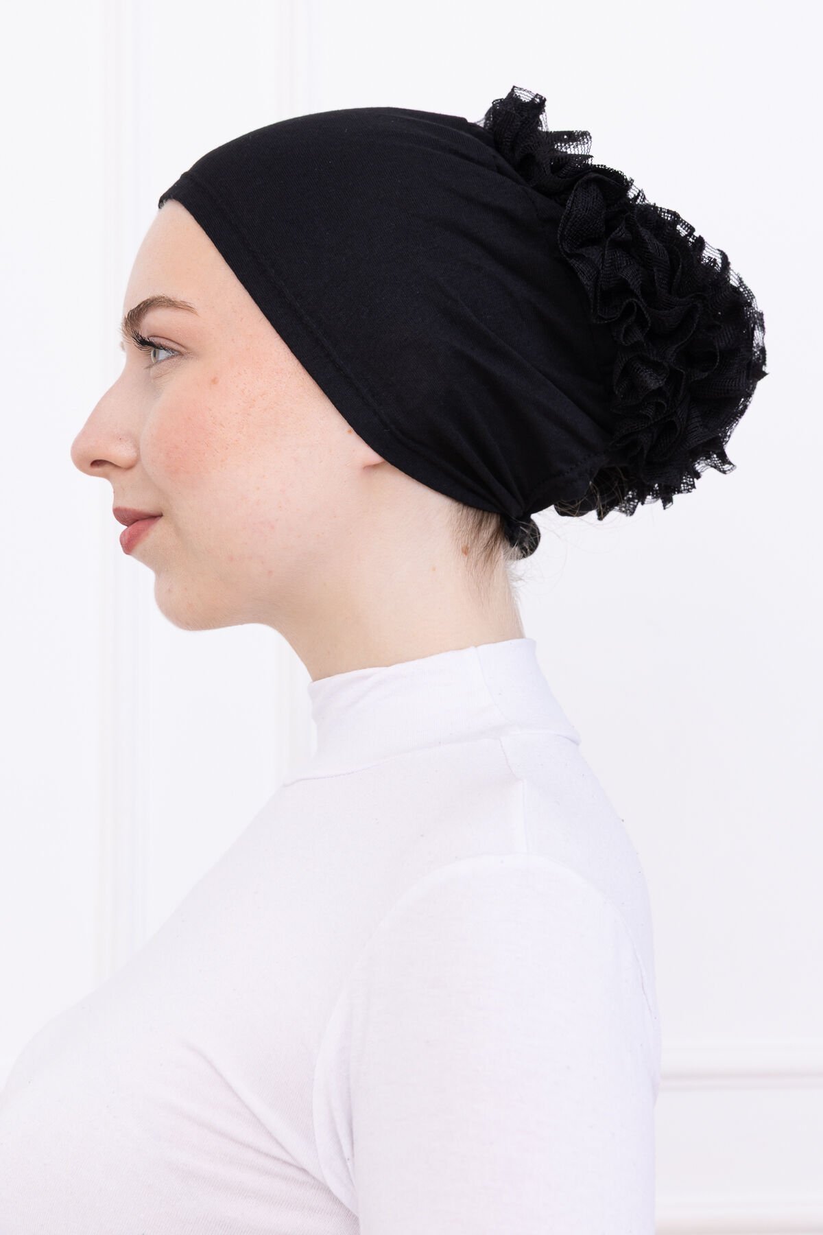 Fırfırlı Önden Dikişli Penye Bone - Kadın Tesettür Bağlamalı Topuz İç Bone Siyah