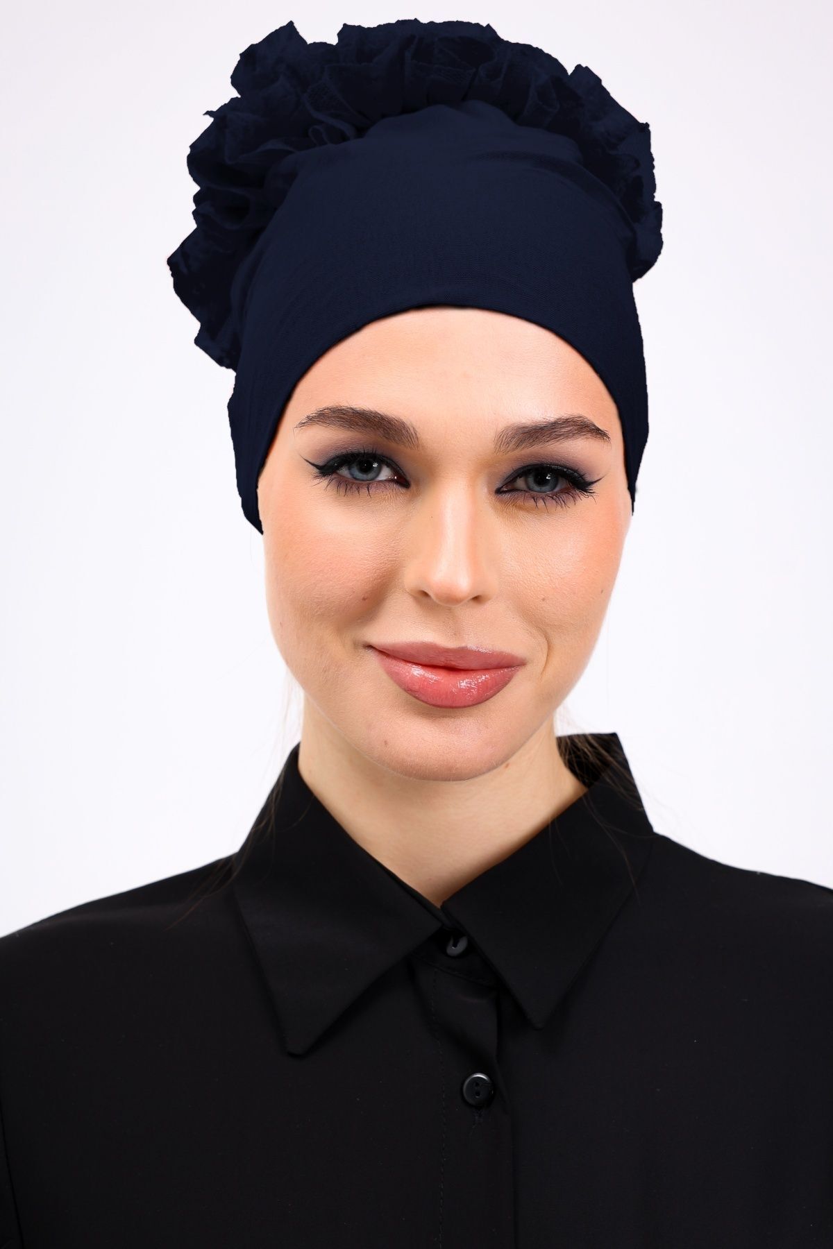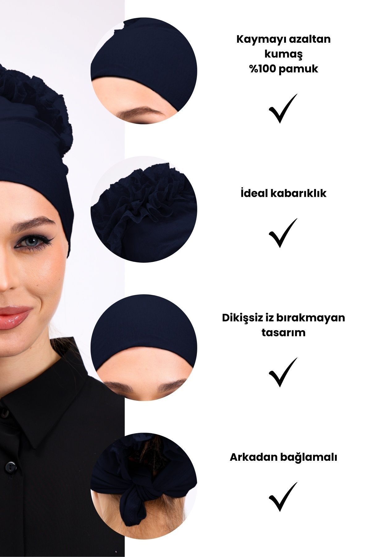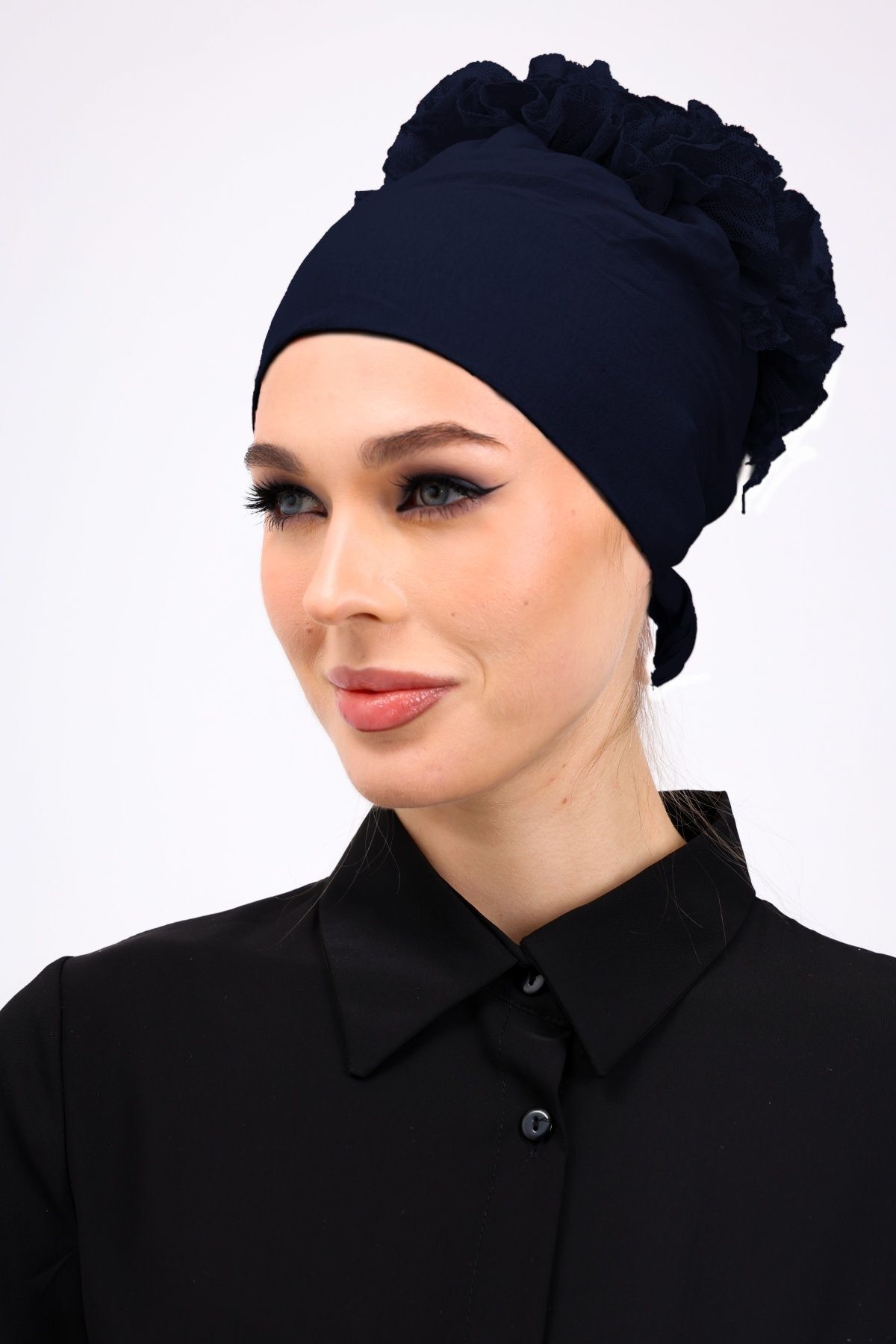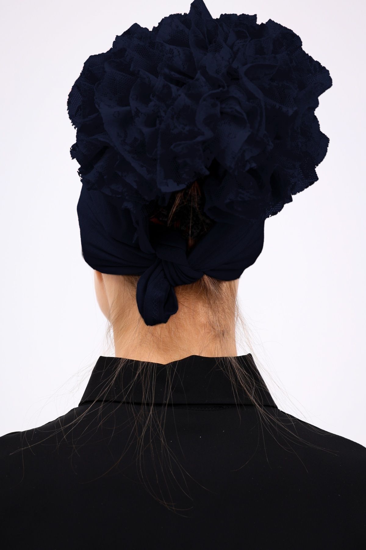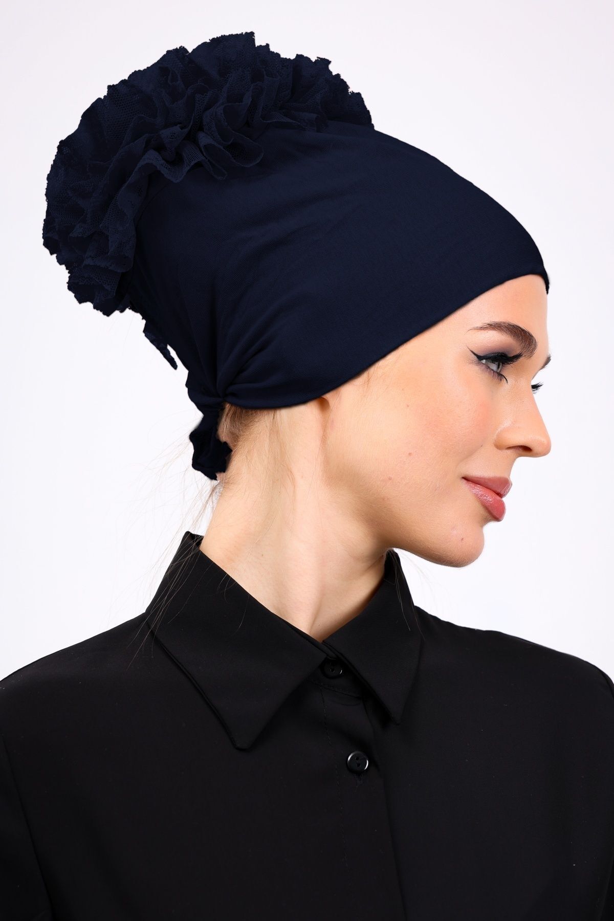 Fırfırlı Dikişsiz Penye Bone - Kadın Tesettür Bağlamalı Topuz İç Bone Lacivert