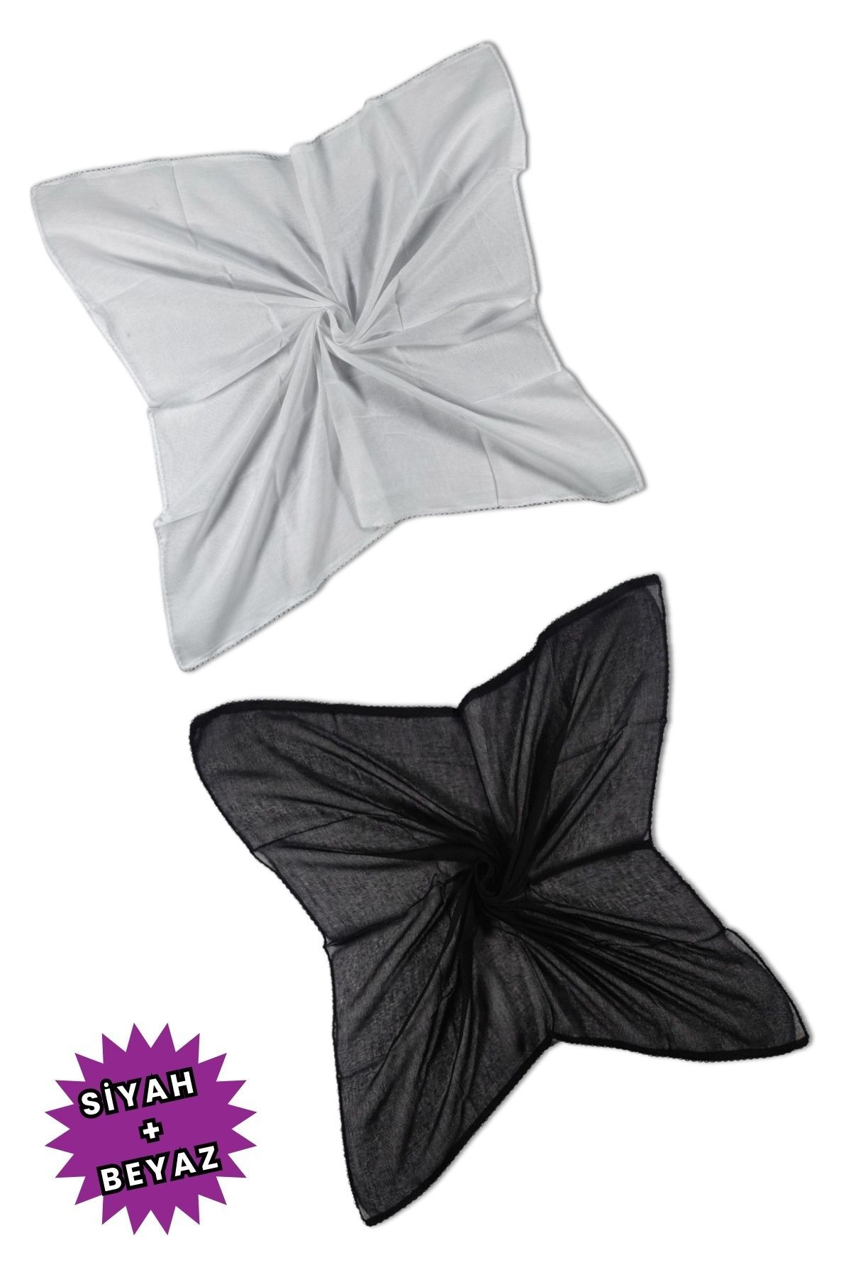 İç Başörtüsü %100 Pamuklu Tülbent - Kenarları Oyalı 90x90 Cm Kadın Tesettür Yazma Başörtü 2Li Siyah Beyaz