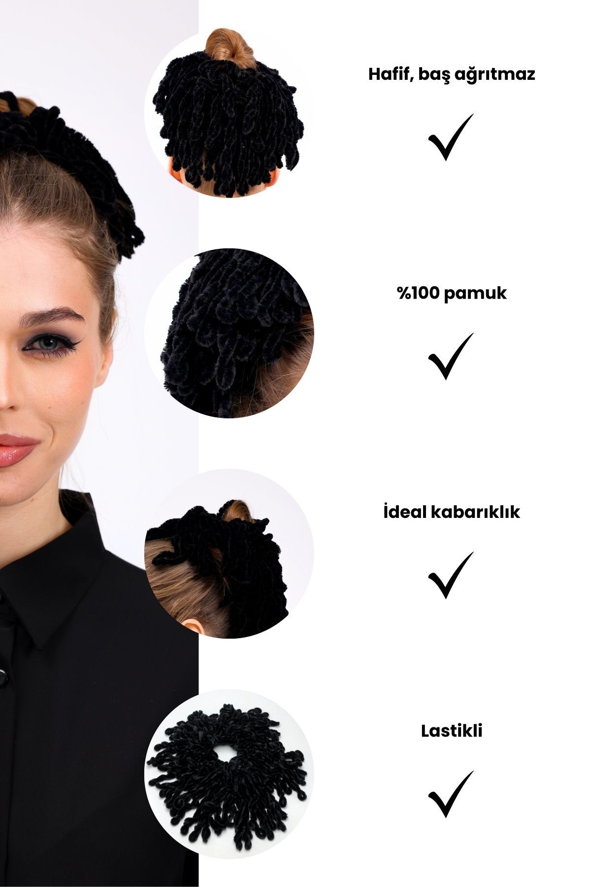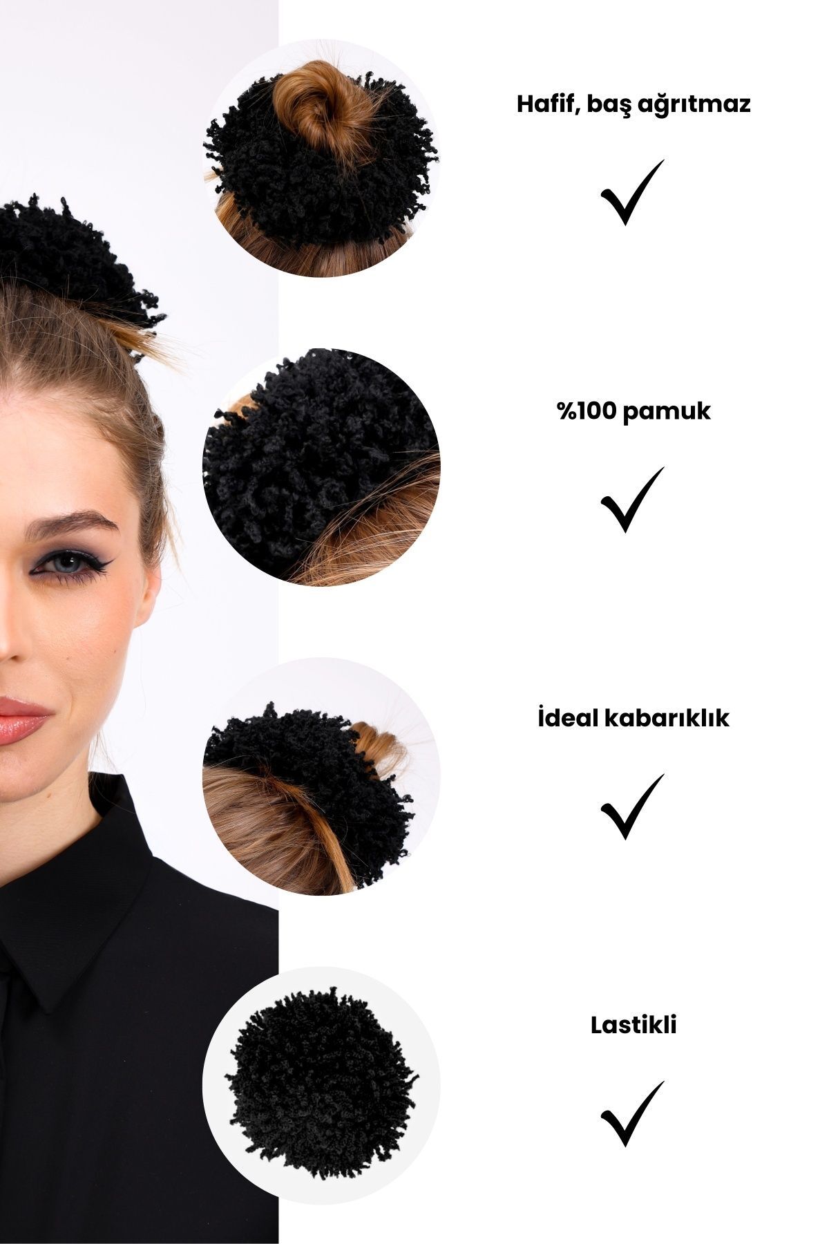 Özel tasarımı sayesinde saçlarınızı toplar ve sabitler. Dolgun ve sabit görünüm için pratik kullanım sağlar. Lastikli yapısı sayesinde topuza uyum sağlar. Saçınızı kolayca şekillendirir. Topuz tokası, tesettürlü kadınlar için eşarp ve şalın altında dolgun ve düzgün bir görünüm elde etmeye yardımcı olan pratik bir aksesuardır. Hafif ve esnek yapısı sayesinde başı rahatsız etmez, gün boyu konforlu bir kullanım sunar. Topuz tokası tesettür giyimde konfor ve pratiklik sağlayan tamamlayıcı bir aksesuardır. Düz deseniyle sade ve şık bir görünüm sağlar, her türlü kıyafetle kolayca kombinlenebilir. Günlük kullanım, iş hayatı, özel davetler ve spor yaparken rahatça tercih edilebilir. Şal ve eşarpların altına kolayca uyum sağlayarak kusursuz bir görünüm elde etmenize yardımcı olur. Her yaş grubuna hitap eden tasarımıyla geniş kullanıcı kitlesine uygunluk sağlar. Loggia tarafından üretilmiş olup kalite standartlarına uygun olarak tasarlanmıştır. Fotoğraf çekimleri sırasında ışıktan kaynaklı ton farkları olabilir. Ürünlerimiz yerli üretimdir. Türkiye'de üretilmiştir. Ürün Boyutu: Standart Paket İçeriği: 2 adet Topuz Tokası - Beyaz Kadife ve Arap Saçı