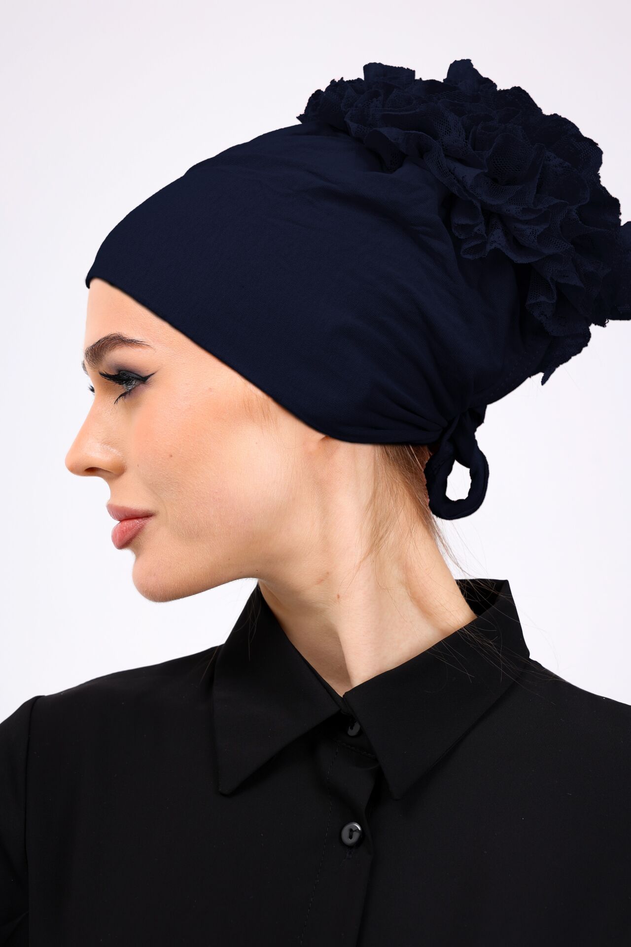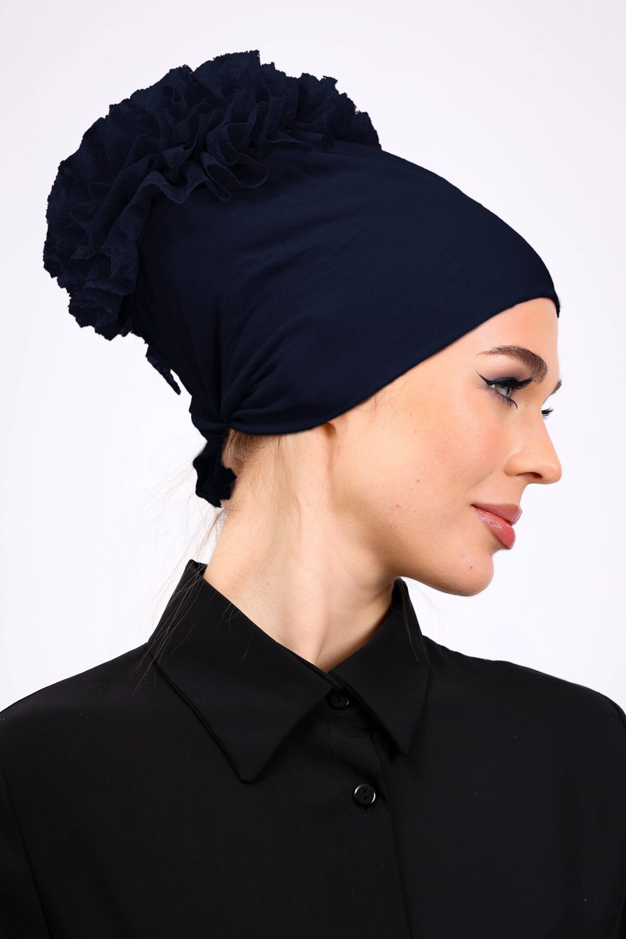 Kaymayan Fırfırlı Silikonlu Dikişsiz Bone - Kaymaz Kadın Tesettür Bağlamalı İç Bone Lacivert