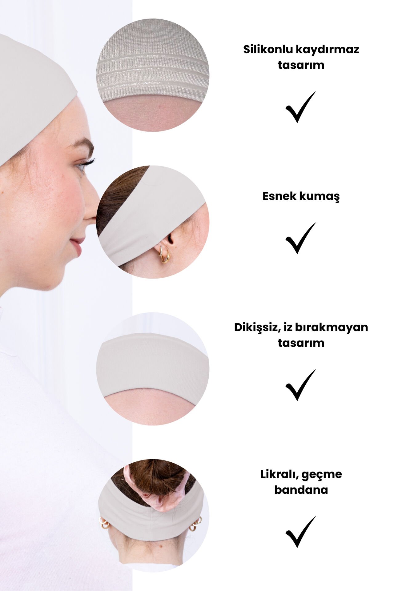 - Ön kısmı dikişsizdir. Eşarpların altında iz yapmaz ve pürüzsüz görünüm sağlar.