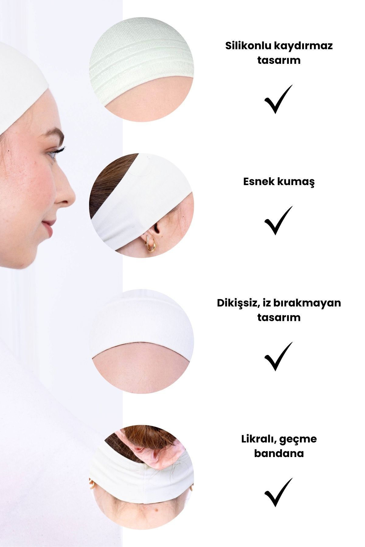 - Ön kısmı dikişsizdir. Eşarpların altında iz yapmaz ve pürüzsüz görünüm sağlar.