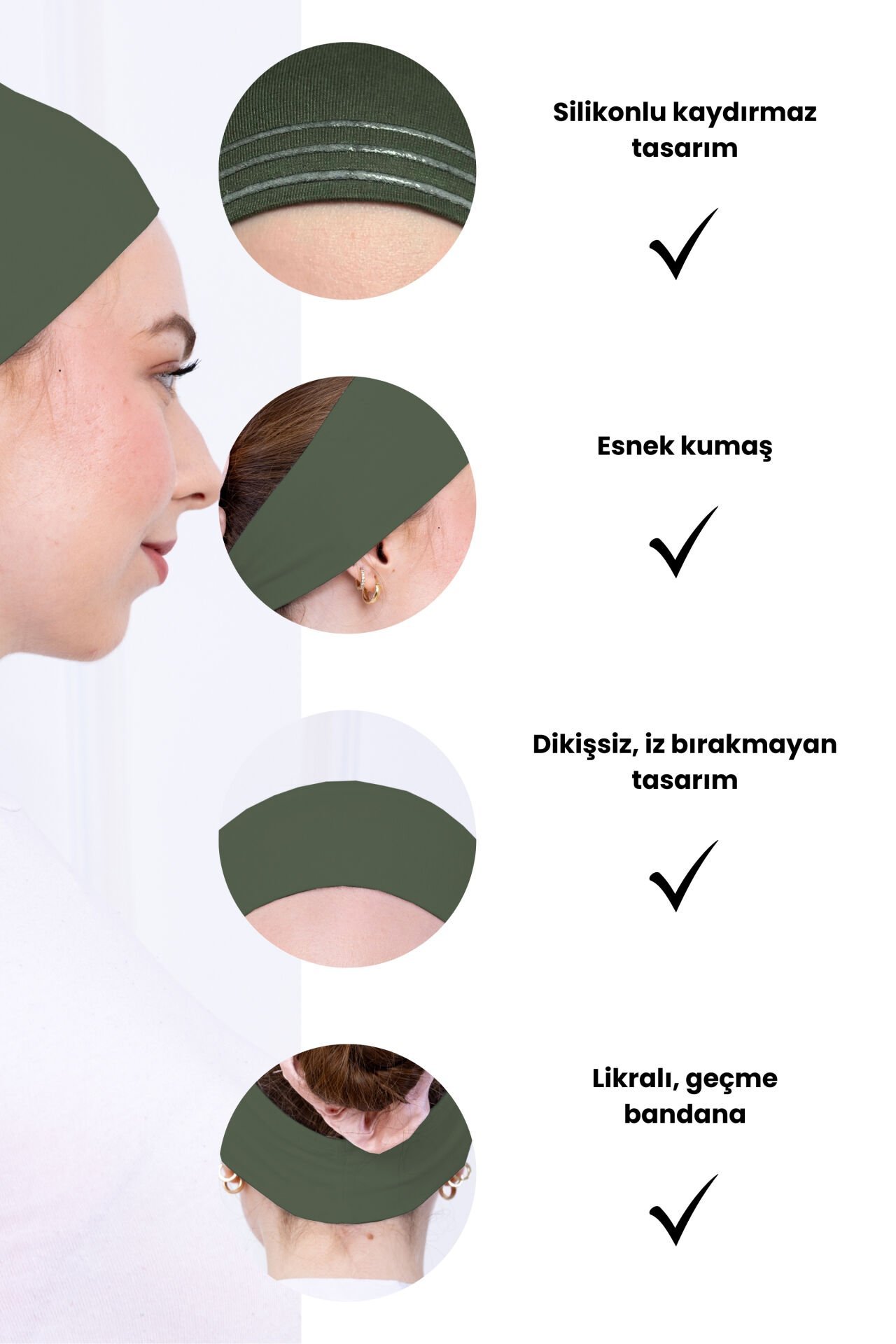 Kaymayan Silikonlu Bandana Bone - Sportif Saç Bandı Haki