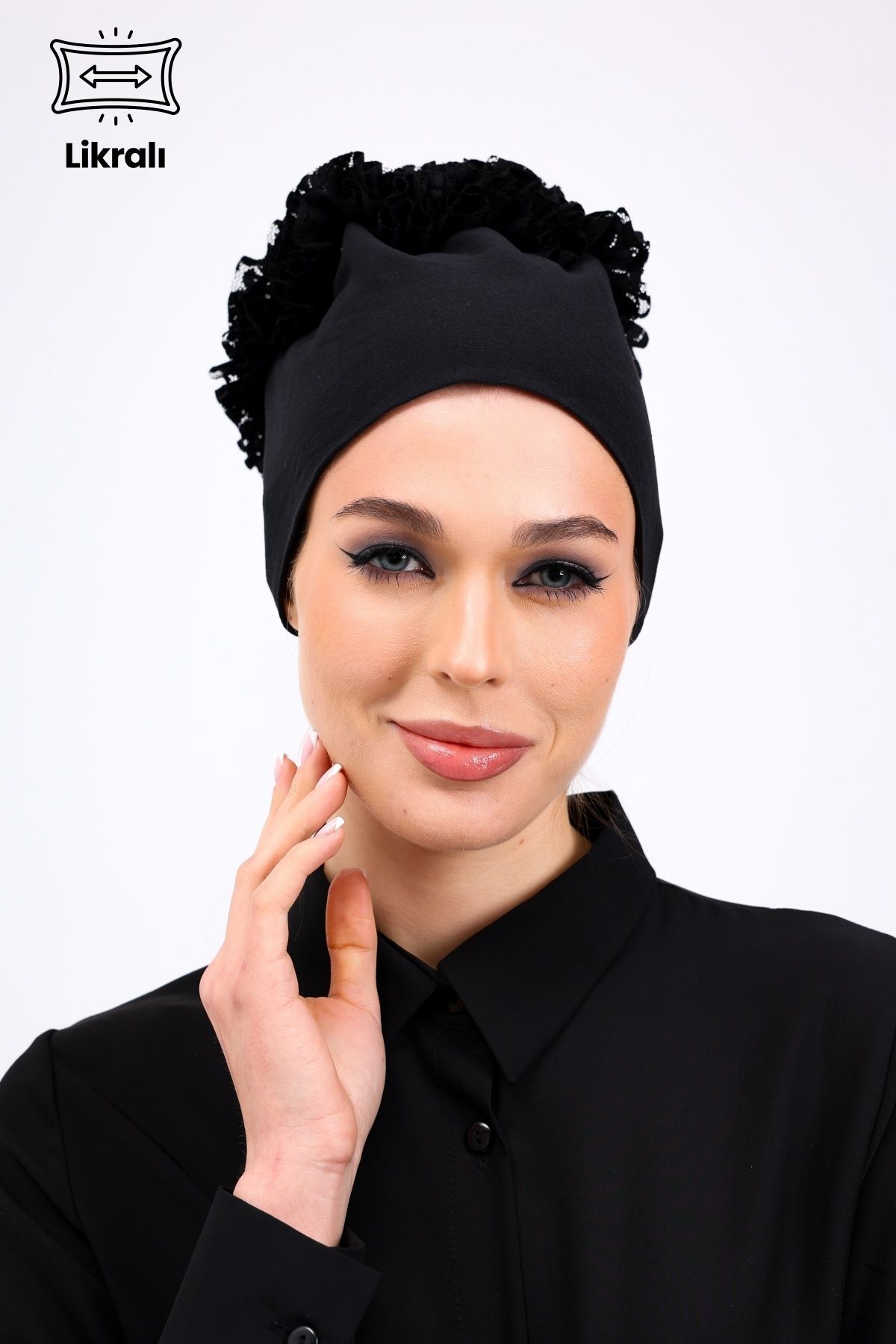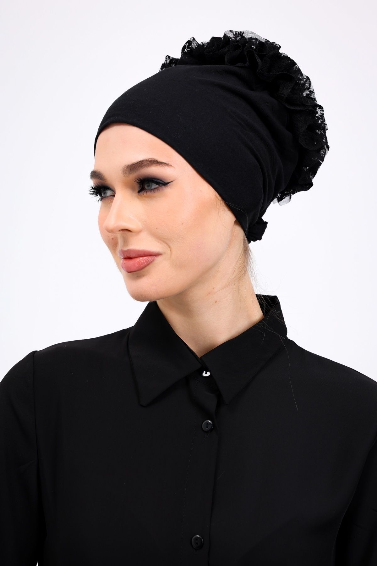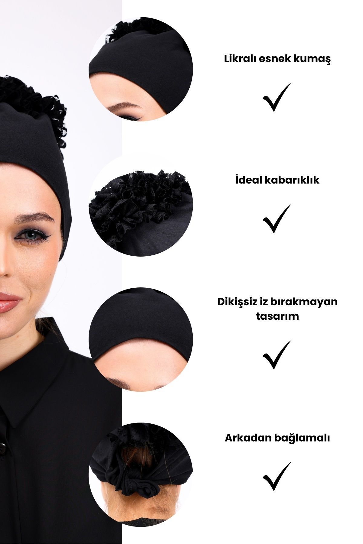 Likralı Fırfırlı Dikişsiz Bone - Kadın Tesettür Bağlamalı Topuz İç Bone Viskon Siyah