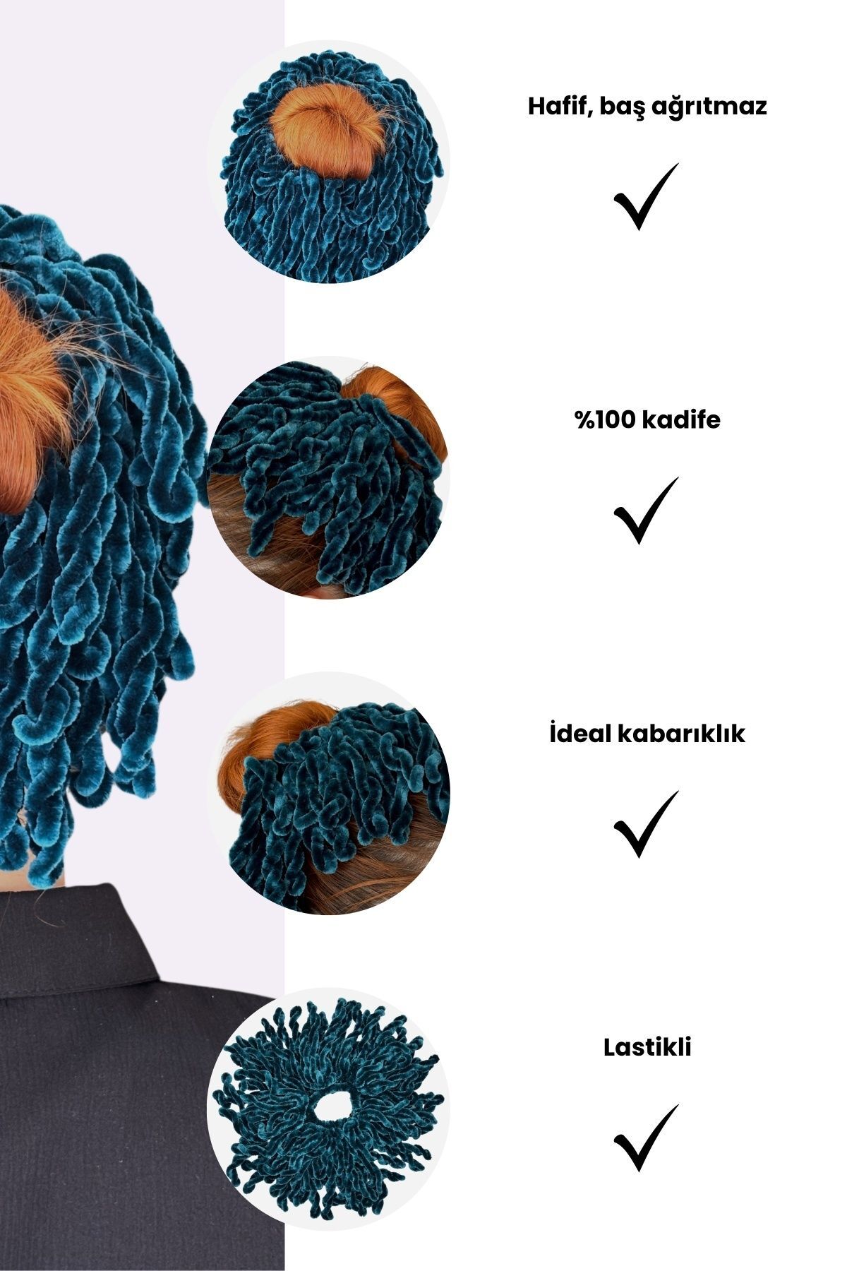 Özel tasarımı sayesinde saçlarınızı toplar ve sabitler. Dolgun ve sabit görünüm için pratik kullanım sağlar. Kadife ipten üretilmiştir. Lastikli yapısı sayesinde topuza uyum sağlar. Saçınızı kolayca şekillendirir. Hafif ve esnek yapısı sayesinde başı rahatsız etmez, gün boyu konforlu bir kullanım sunar. Topuz tokası tesettür giyimde konfor ve pratiklik sağlayan tamamlayıcı bir aksesuardır. Şal ve eşarpların altına kolayca uyum sağlayarak kusursuz bir görünüm elde etmenize yardımcı olur. Topuz tokası, tesettürlü kadınlar için eşarp ve şalın altında dolgun ve düzgün bir görünüm elde etmeye yardımcı olan pratik bir aksesuardır. Loggia tarafından üretilmiş olup kalite standartlarına uygun olarak tasarlanmıştır. Fotoğraf çekimleri sırasında ışıktan kaynaklı ton farkları olabilir. Ürünlerimiz yerli üretimdir. Türkiye'de üretilmiştir. Ürün Boyutu: Standart Paket İçeriği: 1 Adet Kadife Topuz Tokası - Turkuaz Renk